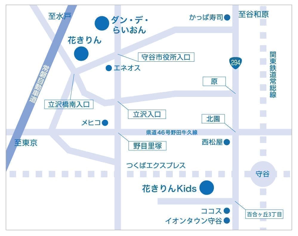 守谷駅(つくばエクスプレス守谷駅・関東鉄道常総線守谷駅)よりタクシーにて約10分。